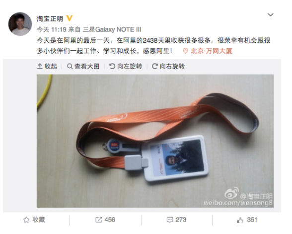 他在微博中寫到:“今天是在阿里的最后一天,在阿里的2438天里收獲很多很多,很榮幸有機(jī)會(huì)跟很多小伙伴們一起工作、學(xué)習(xí)和成長(zhǎng),感恩阿里!”