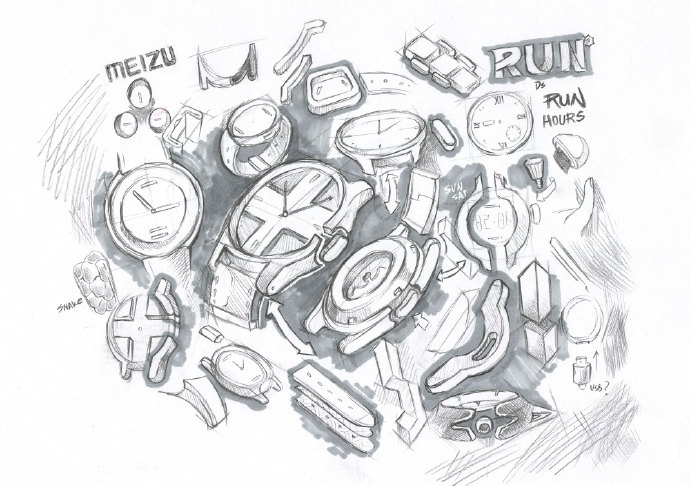 從配圖來看,這是一張各式各樣的手表設(shè)計(jì)草圖,其中還帶有MEIZU和RUN、RUN HOURS等字樣,顯然這是一張魅族智能手表產(chǎn)品的懸疑海報(bào)。